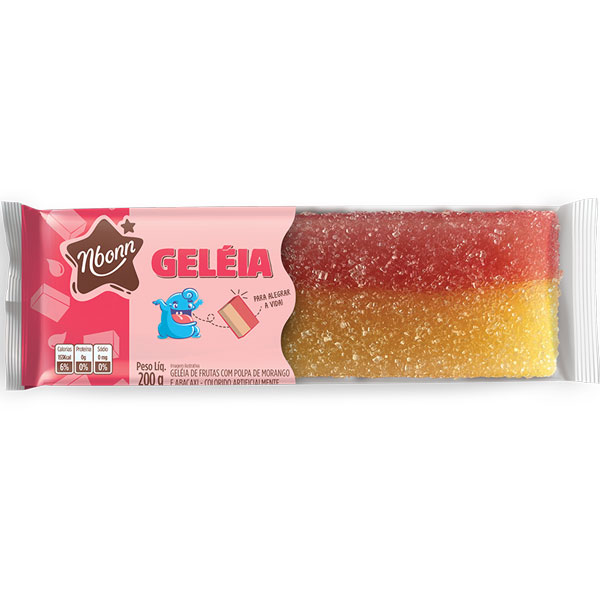 Açúcar, polpa de morango e de maracujá, glicose de milho, pectina, acidulante ácido cítrico, corantes e aromatizantes artificiais idênticos aos naturais.